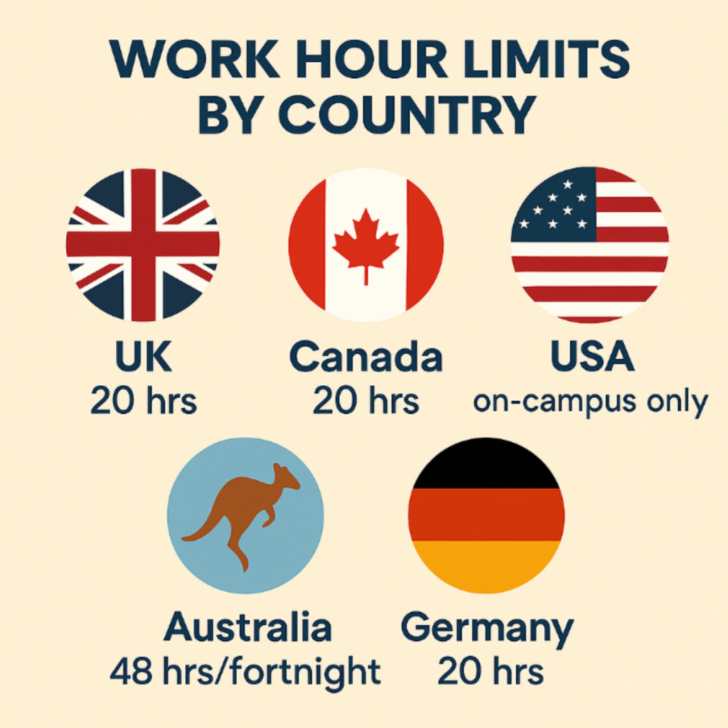 - Work limit: Students can work up to 20 hours per week during term time, and full-time during vacation periods.